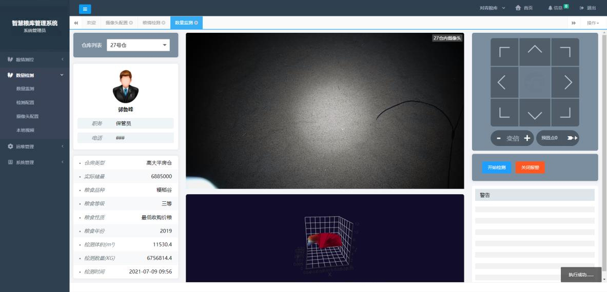 糧食數量監測系統: 數量檢測系統利用高清視頻監控攝像頭作為基礎,利用非接觸式光電測控技術(shù), 能夠及時(shí)、準確的測量糧面平整狀態(tài)的倉房當前糧食的庫存數量,測量結果可供用 戶(hù)及時(shí)查看,對糧食數量和安全進(jìn)行定性層面的監管。該系統可和庫區安防視頻監 控系統一起規劃并建設,智慧糧食系統對接后,即可在系統上進(jìn)行遠程實(shí)時(shí)查看。